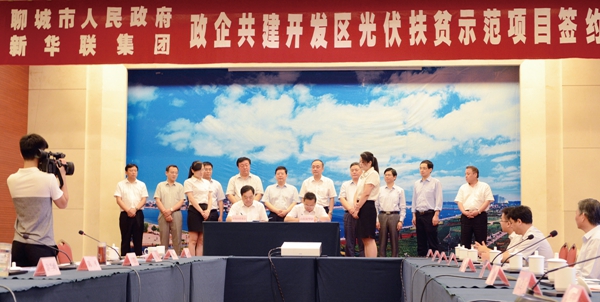 2016年6月23日,集團(tuán)與聊城市政府共同建設(shè)的光伏扶貧示范項(xiàng)目在聊城市會(huì)議接待中心舉行簽約儀式。聊城市委副書記陳平, 副市長(zhǎng)郭建民,市委副秘書長(zhǎng)、市扶貧辦主任許蘭嶺,市政府副秘書長(zhǎng)周兆巖,市經(jīng)濟(jì)技術(shù)開發(fā)區(qū)黨工委書記兼管委會(huì)主任楊廣平,集團(tuán)黨委書記、副總裁丁偉,集團(tuán)助理總裁、工會(huì)主席兼企業(yè)文化部總監(jiān)楊運(yùn)輝,集團(tuán)助理總裁、山東新華聯(lián)新能源公司董事長(zhǎng)兼總經(jīng)理毛自力,集團(tuán)財(cái)務(wù)部總監(jiān)高大鋼及聊城市市直部門、經(jīng)濟(jì)技術(shù)開發(fā)區(qū)有關(guān)部門,山東新華聯(lián)新能源公司、山東新華聯(lián)智能光伏公司的相關(guān)負(fù)責(zé)人出席儀式。郭建民副市長(zhǎng)主持簽約儀式。